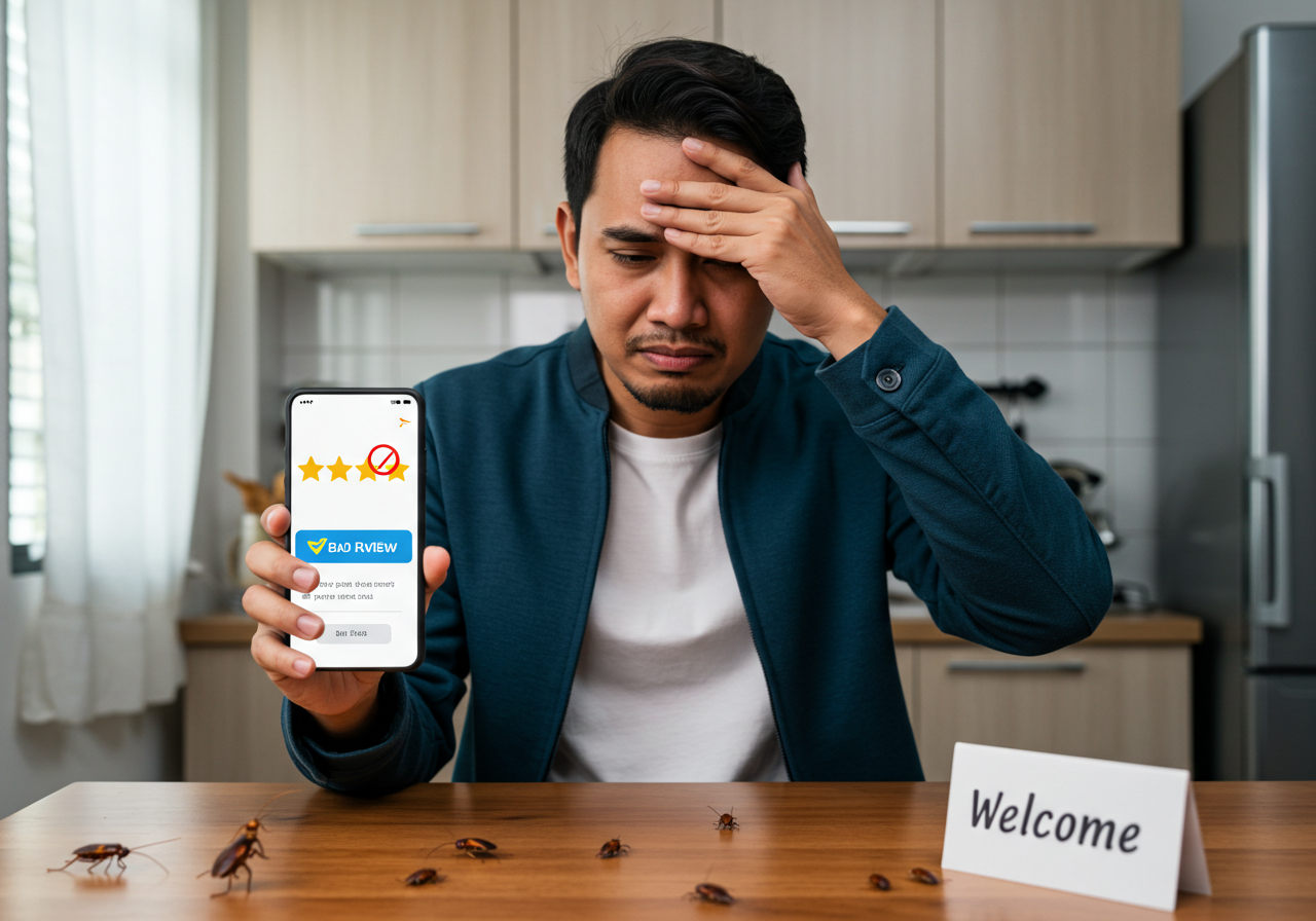 Homestay disusun rapi, cadar baru, tuala berlipat. Notifikasi review masuk—“Rumah cantik, tapi dapur ada lipas kecil.” Satu ayat pendek yang menjatuhkan reputasi. Kita bukan sahaja hilang booking seterusnya, tapi hilang keyakinan diri sebagai hos. Penat jaga standard kebersihan, tapi satu titik lemah jadi punca ‘rating drop’ yang menyakitkan.
