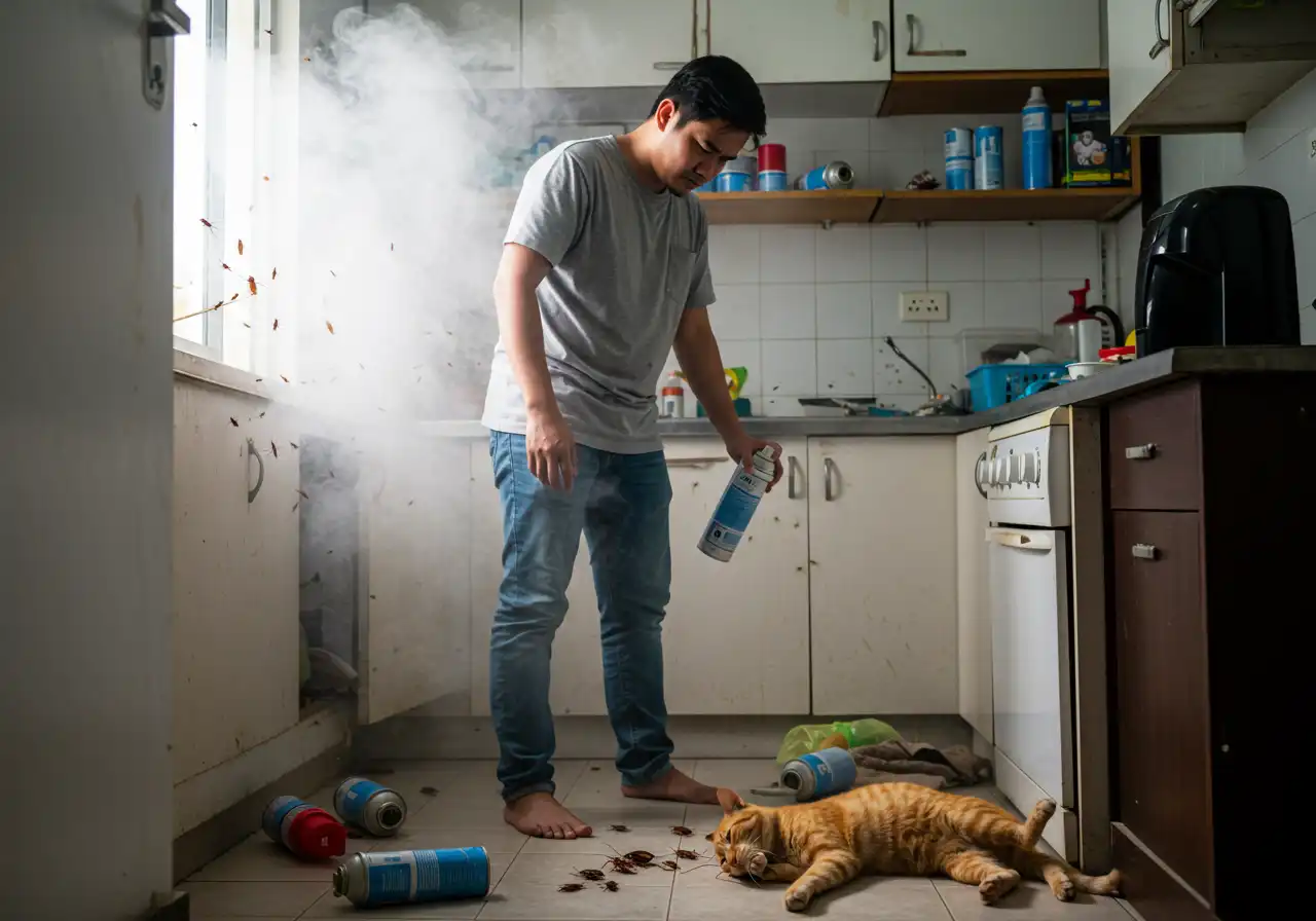Setiap minggu beli spray baru. Sembur—bau menusuk, anak batuk, kucing lari. Lepas beberapa hari, datang balik dari celah yang sama. Duit habis, masa pun hilang. Kita mula persoal: adakah aku cuma sembunyikan masalah, bukan hapus punca? Rasa letih campur benci—kenapa rumah sendiri terasa asing?